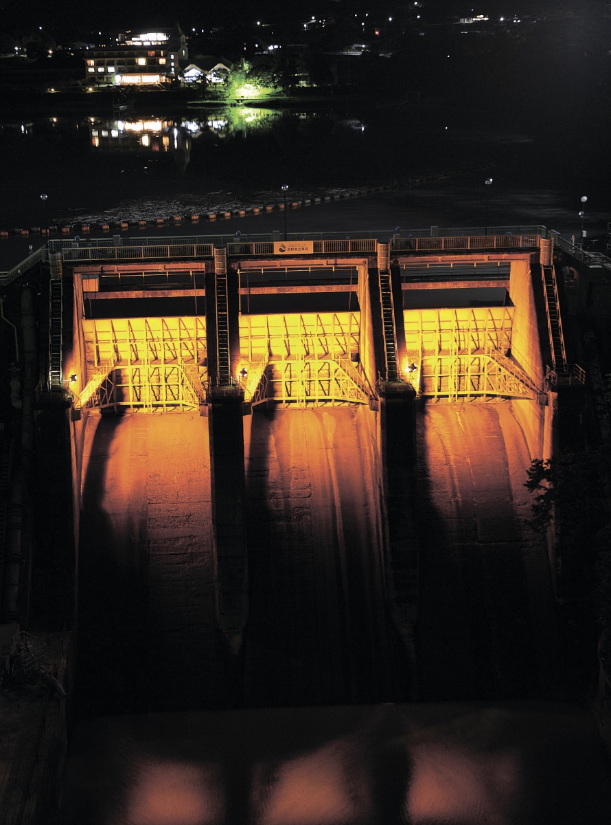 午後6時30分になると、照明が点灯され、ダムの姿がオレンジ色に浮かび上がった。点灯時間は午後10時まで。