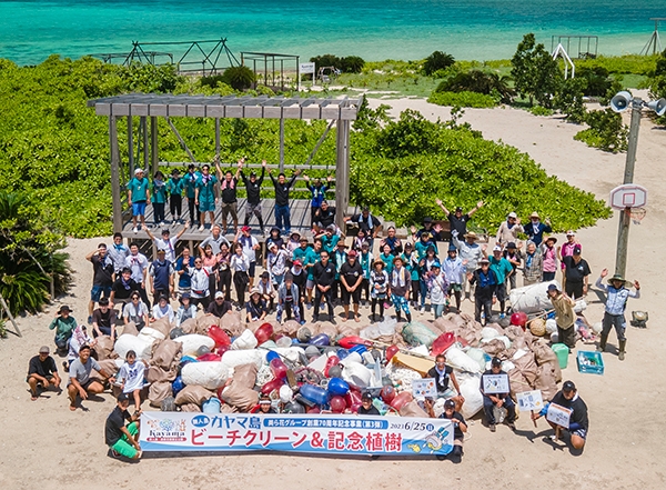同事業は、同グループの創業70周年を記念したイベントの第3弾。同島のブルーロックビーチや恋人の浜、ノッチ岩、海人の岩の4カ所から土のう袋220袋と漁具など約2.5㌧の海洋ごみを回収した。