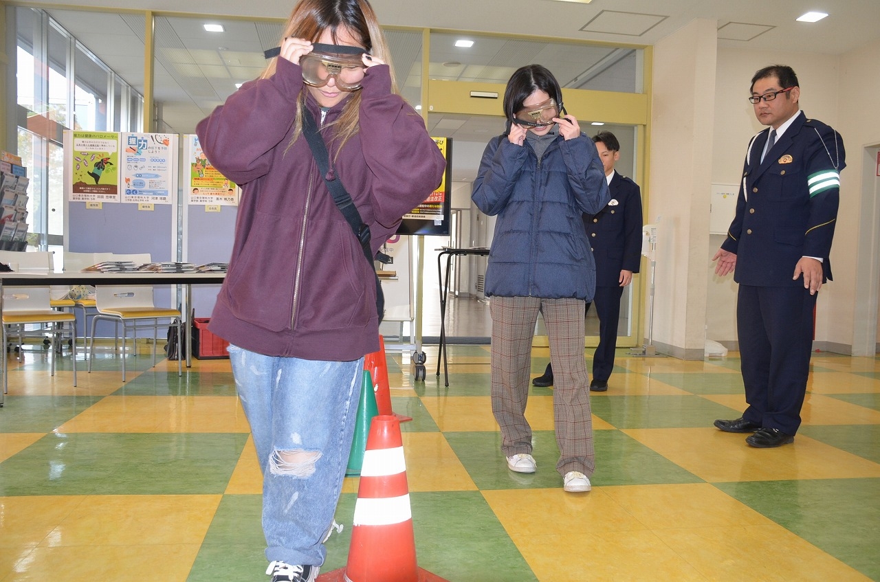 また11月1日から道路交通法の一部改正で自転車に関する罰則が強化されたことを受け、飲酒体験ゴーグルで危険性を体感した。ゴーグルを装着した学生たちがフロアに並べられたコーンの間をじぐざぐに歩行。自分が思っているポイントに思うように足を運べず、コーンを蹴り倒してしまう場面もあった。