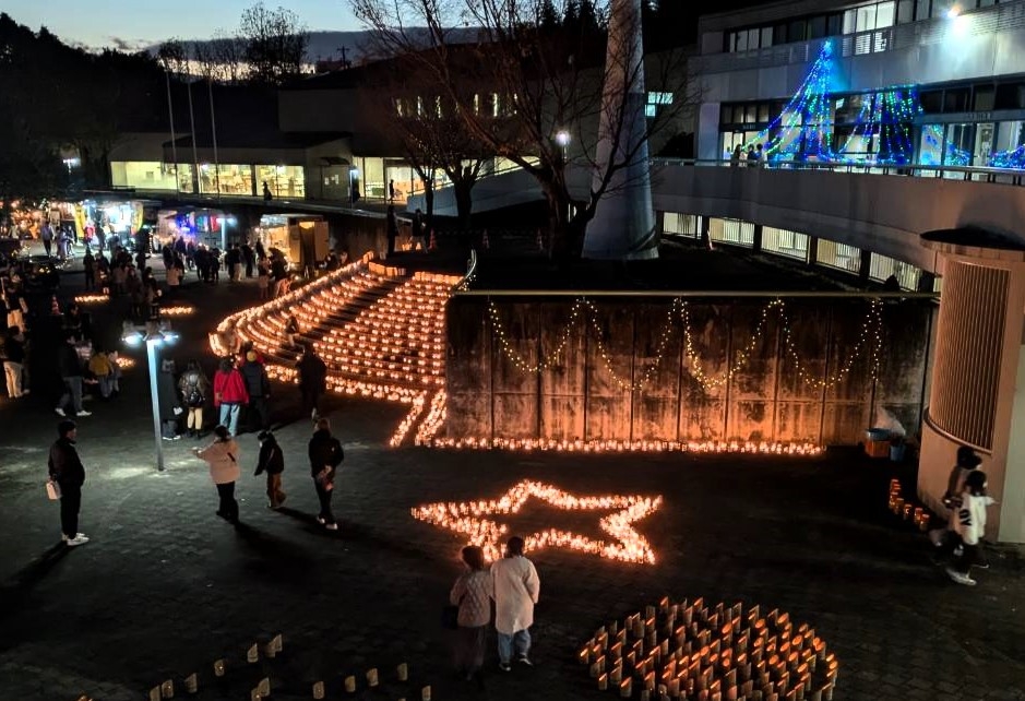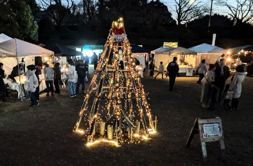 屋外の広場では高さ3㍍の「竹のクリスマスツリー」が登場した。8日に同市下吉田の林から切り出して円すい状に組み立て、内側を光らせた。他にも約5000個のキャンドルを階段や広場に配置し、点灯した。