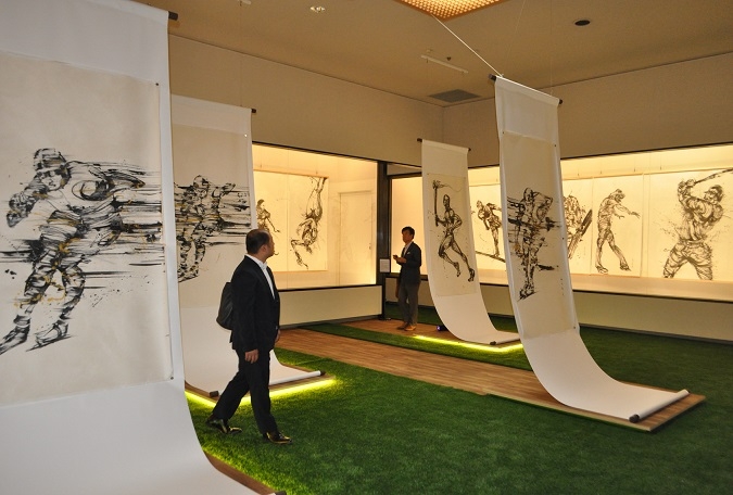 これらの縁で美術館を開館し、学生時代から現在までの作品を展示した。展示室の入り口には、迫力満点の「阿吽の狐」が左右に並び、来館者を迎える。力強い「侍」、躍動感あふれるアスリートなど、さまざまな墨絵が並ぶ。現代風の展示で、プロジェクションマッピングなど光と音で演出する。