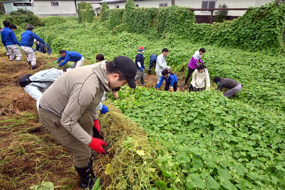 アレチウリが一面に広がる光景を初めて目にした、同社の社員たちは「こんなに広がっているとは思いもしなかった」と驚きの表情。長く伸びたツルをたぐり寄せ、ロール状に巻き取りながら抜き取った。