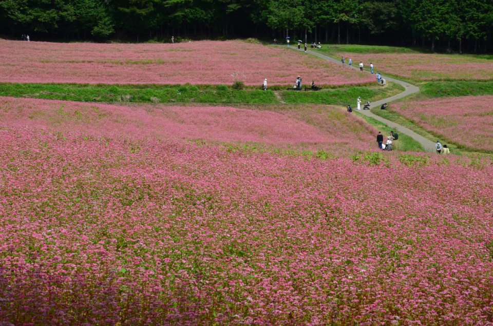 濃いピンク色の花が一面に咲き広がる「赤そばの里」
