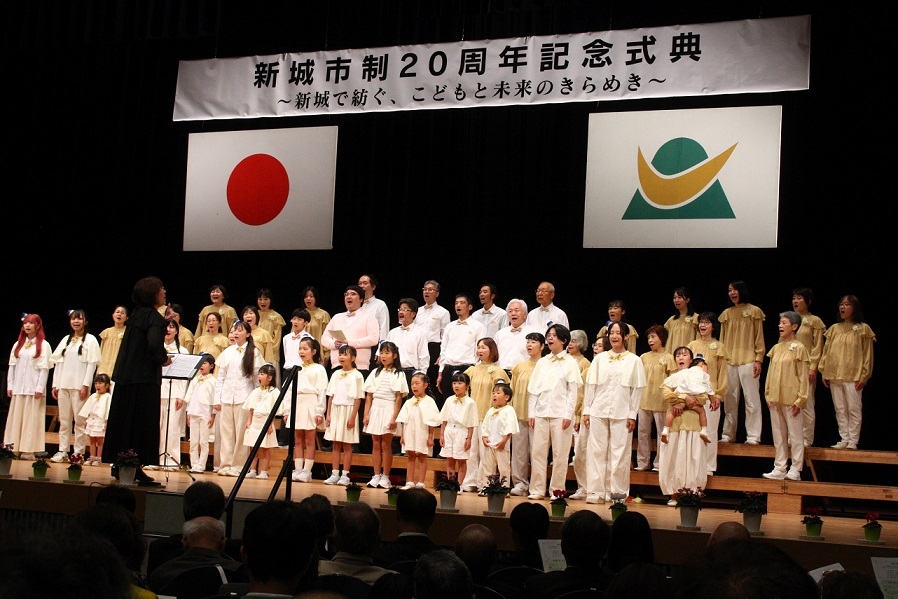 新城市制20周年記念式典が4日、新城文化会館であった。市関係者はじめ大村秀章知事ら994人が出席した。地元出身のお笑い芸人で市観光大使のマヂカルラブリー村上(マヂラブ村上)さんも合唱に参加した。