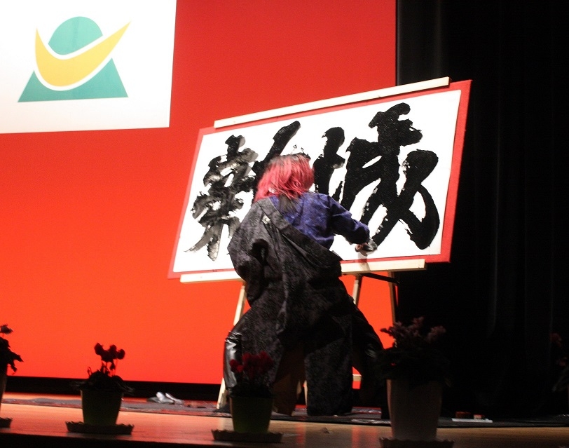 オープニングでは市立鳳来中学校生徒や長篠陣太鼓による和太鼓演奏と、書家潤玲鳳(うるい・れいほう)さんによる書道パフォーマンスがあった。潤さんは縦1㍍、横2㍍の紙に「煌(きら)めく」「新城」の文字を揮ごうした。6日以降は市役所で展示する。