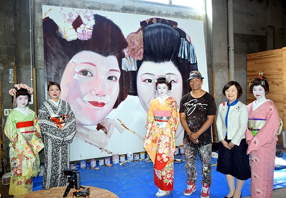 自ら描いた壁画を前に矢口明子市長、酒田舞娘らに囲まれるバルガスさん(右から3人目)=8日午前、サカタント