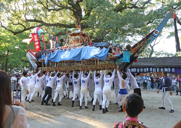 和歌山県白浜町日置、日出神社の例祭が13日に営まれた。重さ約1トン、長さ約9メートルの神船(みふね)が約20人の氏子に何度も持ち上げられ、見物人を楽しませた。